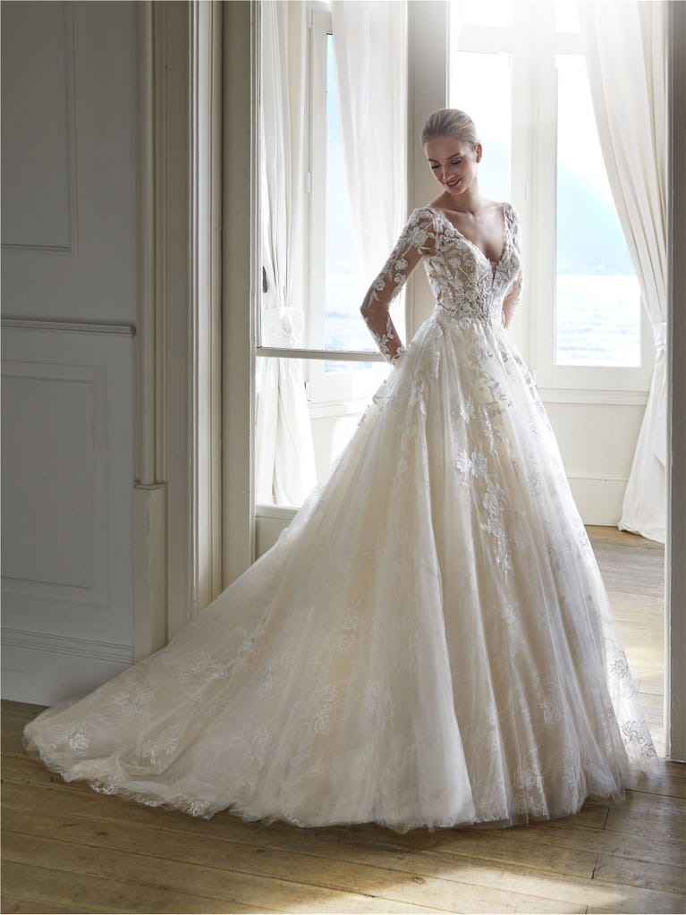 Silueta princesa en tul con encaje Chantilly, bordados y cuentas. El escote en V y las mangas largas le confieren un aire moderno y regio.