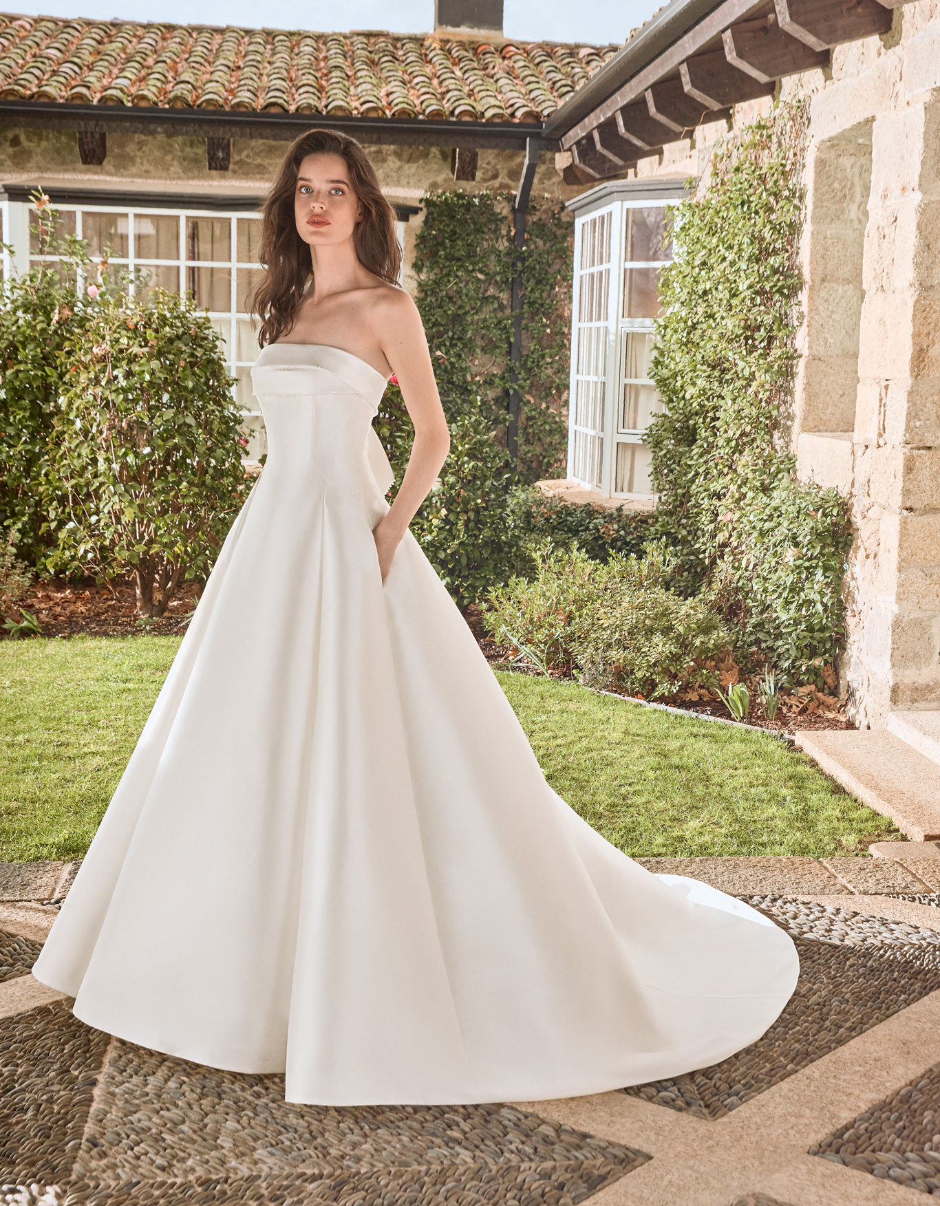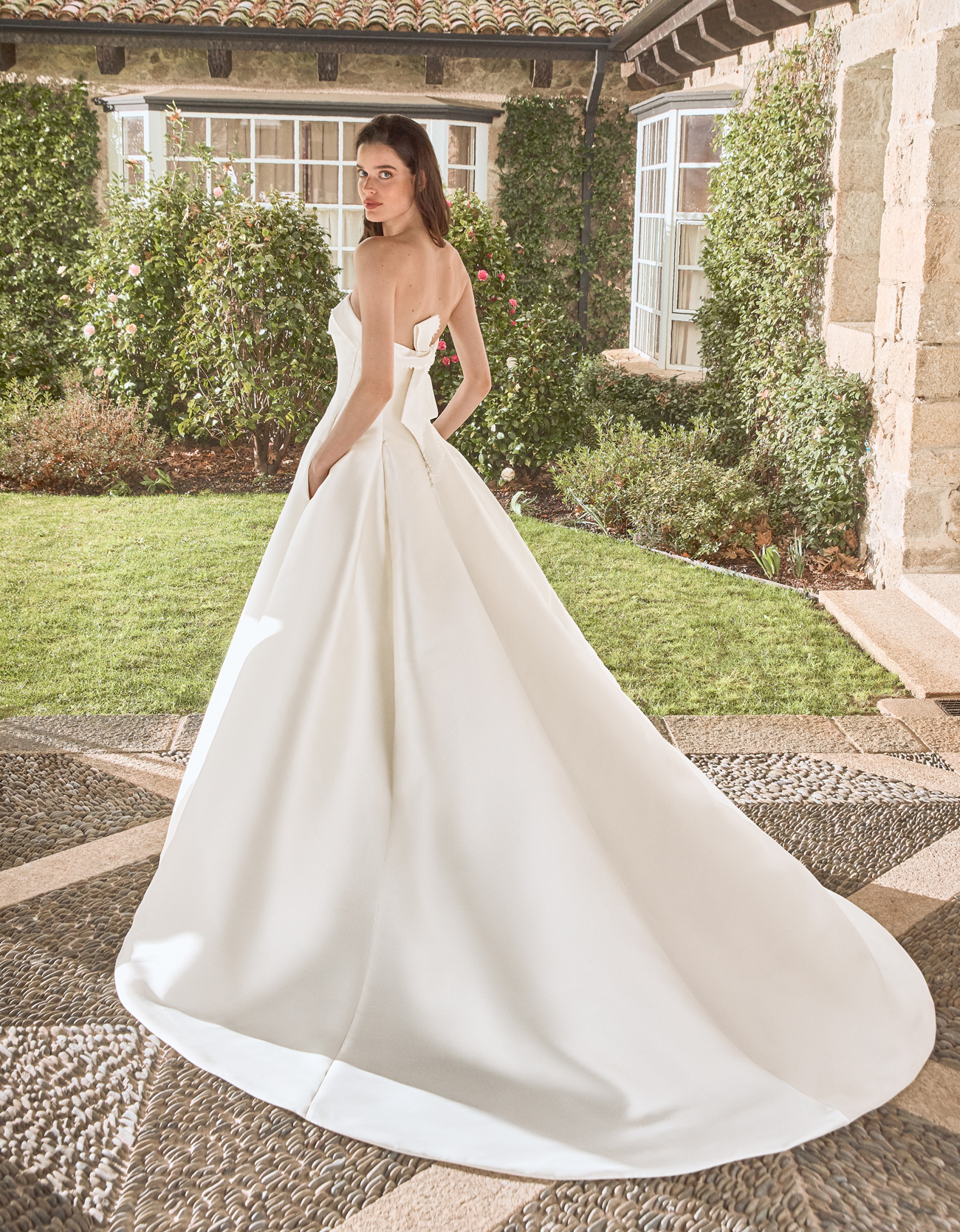 Vestido de corte princesa y escote palabra de honor, confeccionado en mikado ida. Detalles de pedrería en el escote y en la lazada trasera.
