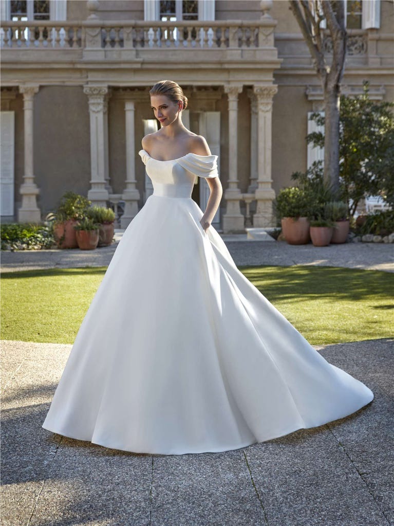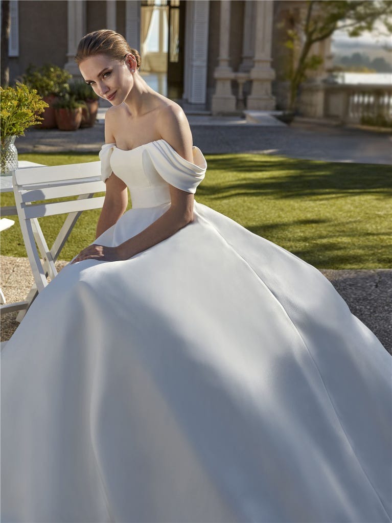 Vestido de mikado suave con corte princesa y escote palabra de honor. Una opción clásica con un toque moderno.