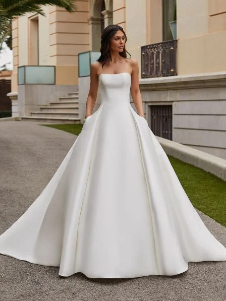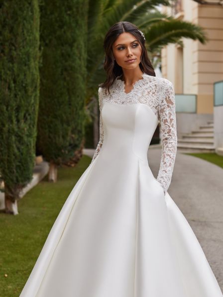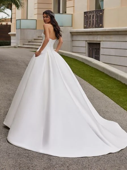 Vestido de novia princesa con palabra de honor con manga larga y espalda descubierta en mikado.