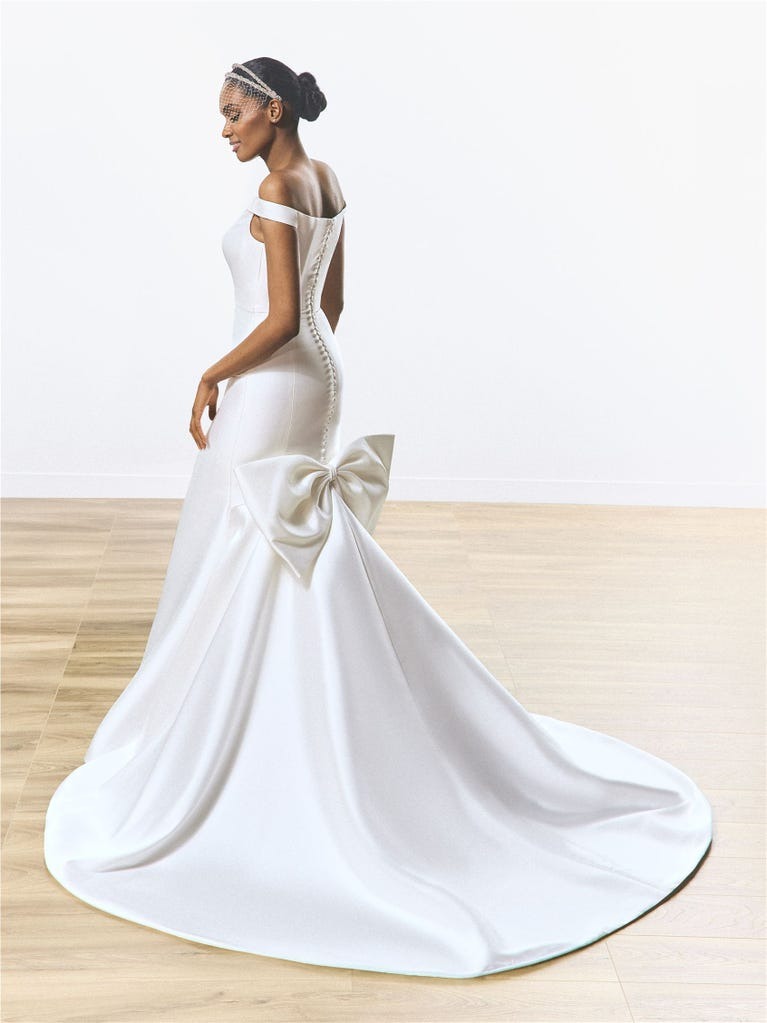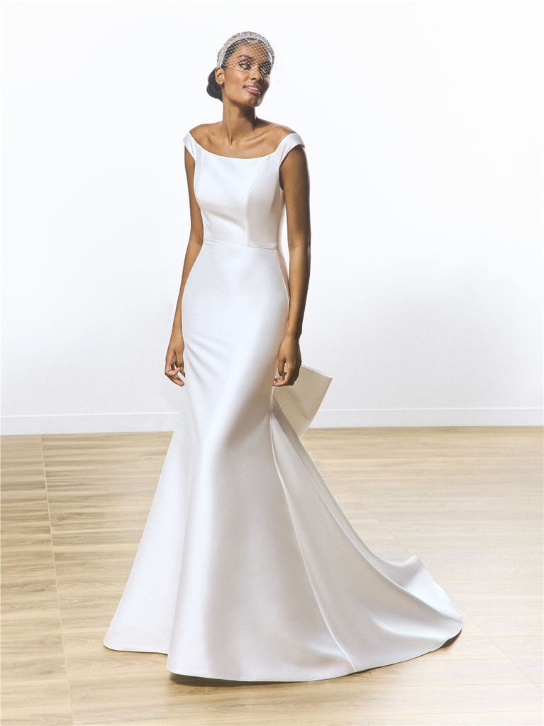Esculpido en mikado luminoso, este vestido sirena con hombros descubiertos encarna el glamour moderno. Sus líneas limpias y silueta estructurada hacen una declaración audaz y refinada.